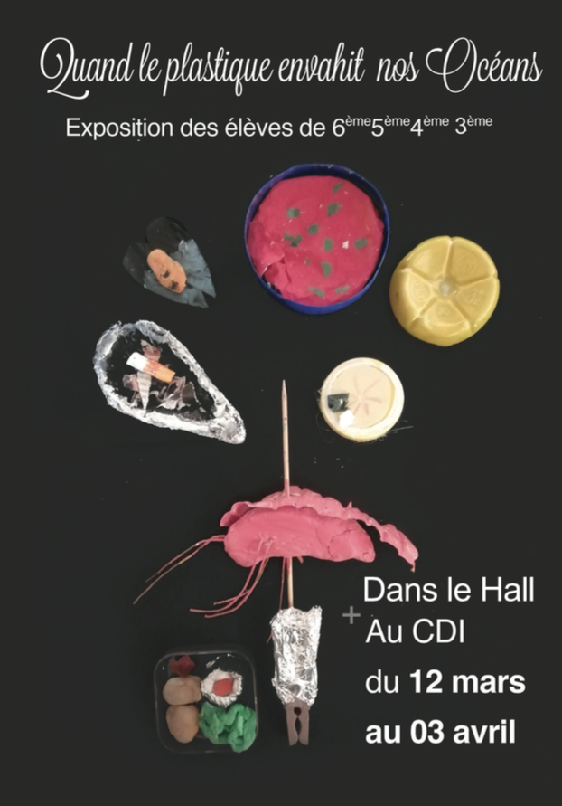 Découvrez à partir du 12 mars et jusqu'au 03 avril, la grande exposition des productions des élèves de L. ARAGON, de 6ème à la 3ème, sur le thème de la pollution des océans.