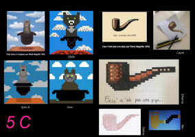 Les élèves de 5ème se sont exercés à reproduire des images d’œuvre à l’aide de carrés uniquement. La contrainte de l’outil oblige à éliminer les détails, simplifier, transformer les courbes et juxtaposer les teintes qui permettront de rendre le volume des corps. Cet exercice ludique développe la capacité d’observation, de repérage ainsi que la motricité fine.